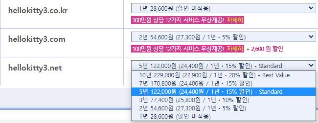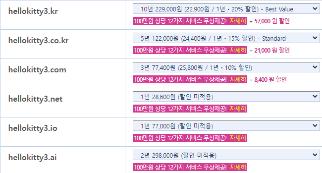 도메인 별로 구입기간별 할인율이 다르고, 특수 도메인 같은 경우(아래 io도메인 77000원) 가격이 다르다. 또한 구입 가능 기간도 1년 단위로 구입 가능한 도메인이 있는 반면, 2년 단위로만 구입가능한 도메인도 있으므로 꼼꼼히 따져봐야 한다.