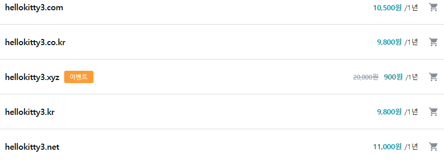 가성비 좋은 호스팅 업체이다. 보통 1만 원 안팎으로 매우 저렴하게 구입이 가능하다. 이벤트를 하는 도메인이 많이 있는데, 아래 xyz 도메인 같은 경우, 900원에 구입할 수 있다. 다만 1년만 구입 가능하고, 2년째부터는 20000원을 결제해야 연장이 된다. 테스트 용으로 사용하기에 매우 좋다.
