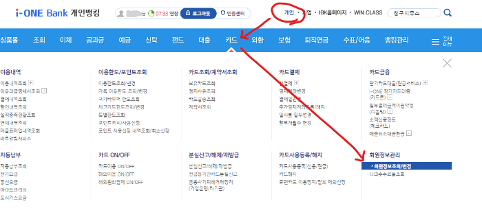 나는 이번 직구에 기업은행카드를 사용할 예정이어서 기업은행에 등록된 내 카드 청구지 주소를 확인해 보았다. 카드 사이트에 접속해서 카드-> 회원정보조회/변경으로 내 카드에 등록된 청구지 주소를 확인할 수 있다.