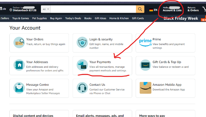 독일 아마존 사이트에 접속 후, 우측 상단의 Account & List 메뉴에서 Your Payments 메뉴를 찾아 들어가자.