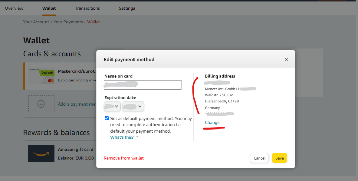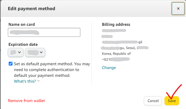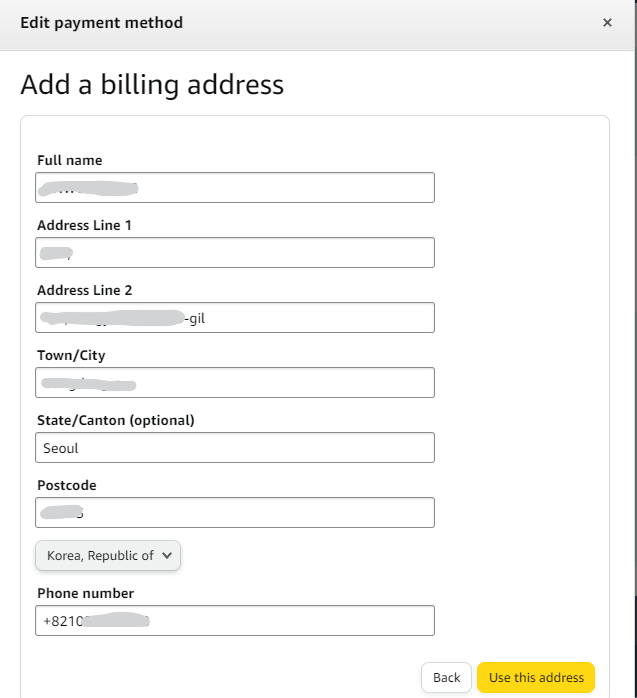 유럽 아마존 직구 시 내 카드 주소를 작성하는데, 국내 카드사에 작성되어 있는 주소와 다르다면 계정이 막힐 수도 있기 때문에, 유럽 직구 시 카드 주소 작성은 주의해야 한다. 카드 요금 청구 주소를 Billing Address라고 한다. 이 Billing Address는 당연히 해당 국가의 언어로 작성해야 한다. 대부분 영어로 작성하는 것 같다.