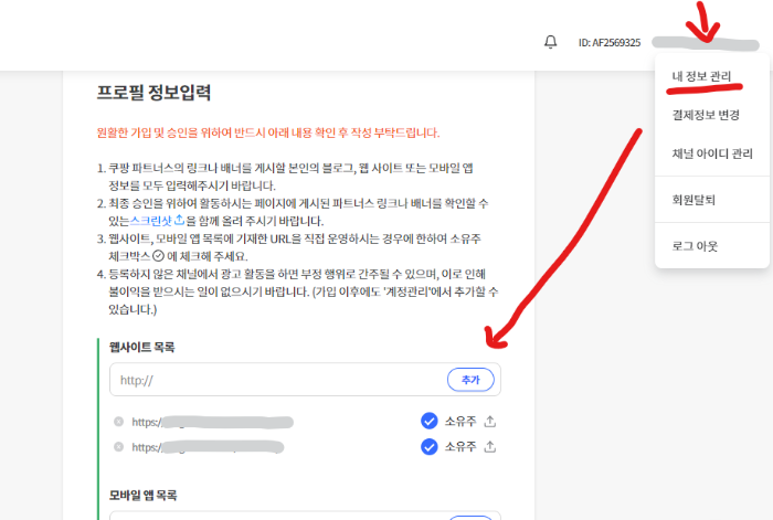 쿠팡파트너스 사이트 로그인 후, 우측 상단에 표시되는 아이디에 마우스 커서를 대면 메뉴가 나온다. 내 정보 관리를 누르면 나오는 화면에서 웹사이트를 추가하면 된다.