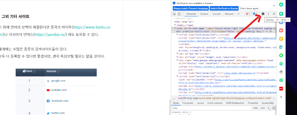 마우스 우클릭이 금지된 블로그에서 F12를 눌러 개발자 도구를 연다. 개발자 도구에서 F1 키를 누르거나 우측 상단의 설정 아이콘을 눌러서 Settings 화면으로 이동한다.