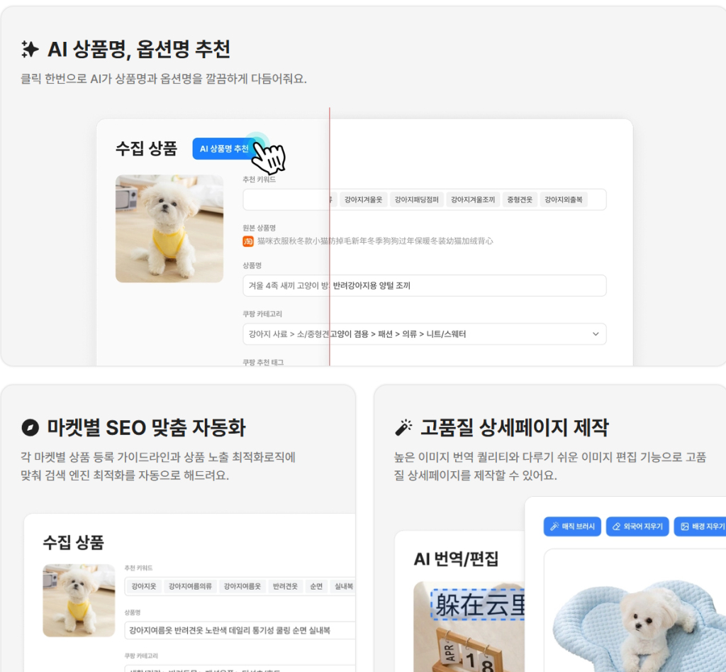 수집된 상품명과 옵션은 AI가 자동으로 번역한다. 특히 호평받는 기능은 ‘이미지 번역’이다. 중국어나 영어로 가득한 상세 페이지 이미지를 클릭 몇 번으로 깔끔하게 한국어로 번역 및 수정할 수 있다. 이는 상세 페이지 제작 시간을 획기적으로 단축시킨다.