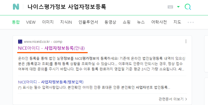 네이버에 나이스평가정보 사업자정보등록이라고 입력하면 바로 사업자를 등록할 수 있는 메뉴가 나온다.