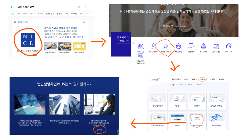 NICE평가정보로 접속 한 후, 하단의 NICE아이디를 선택하고 전체서비스 메뉴에서 법인실명확인PLUS 메뉴를 선택한 후, 중간의 등록하기를 눌러서 등록을 시작할 수 있다. 조금 돌아서 가야 하기 때문에 그냥 위의 나이스평가정보 사업자정보등록으로 검색해서 등록하는 것을 추천한다.