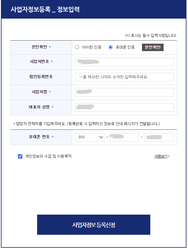 본인 확인을 위해 휴대폰 인증을 하고 본인의 사업자 정보를 작성한 후, 등록신청을 선택한다.