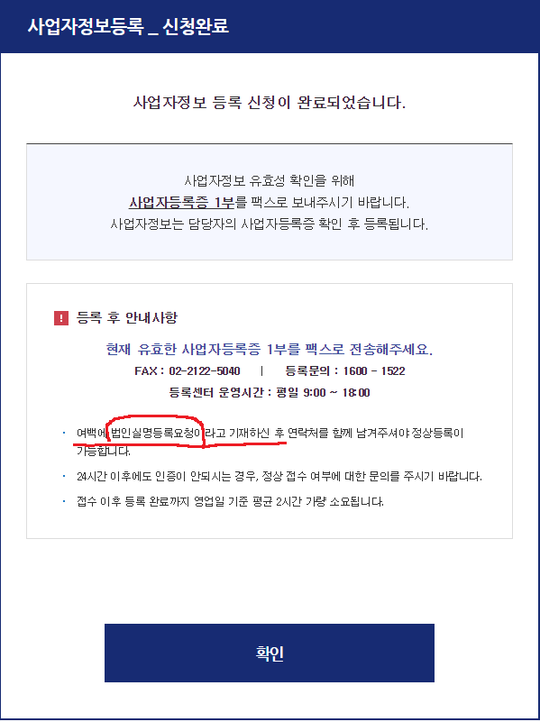 팩스를 보내고 보통 영업일 기준 24시간 후에 등록이 되는데, 급히 처리가 필요하다면 등록 문의 전화번호(1600-1500)로 전화하면 빨리 처리해 준다.
