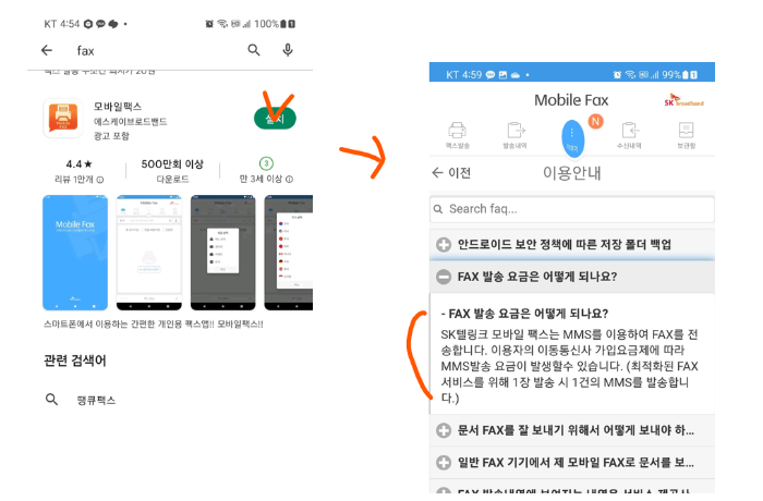 팩스는 휴대폰으로 팩스를 보낼 수 있는 어플 중 모바일팩스 어플을 이용하는 것을 추천한다. 팩스 송신 시, MMS 1건 요금만 발생하므로, 거의 무료라고 봐도 될 것 같다. 사진 또는 문서 파일로 가지고 있는 것을 보낼 수 있다.